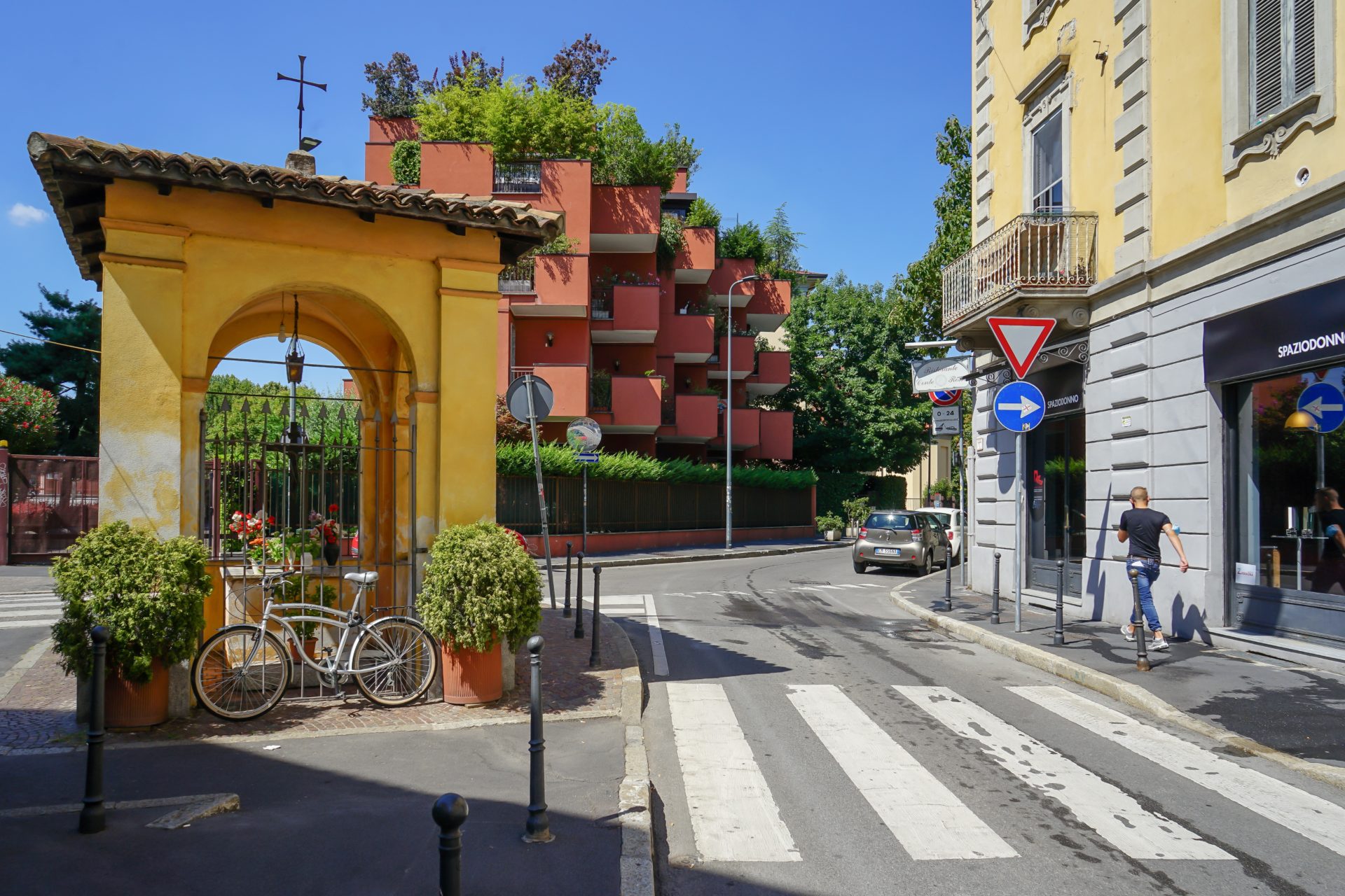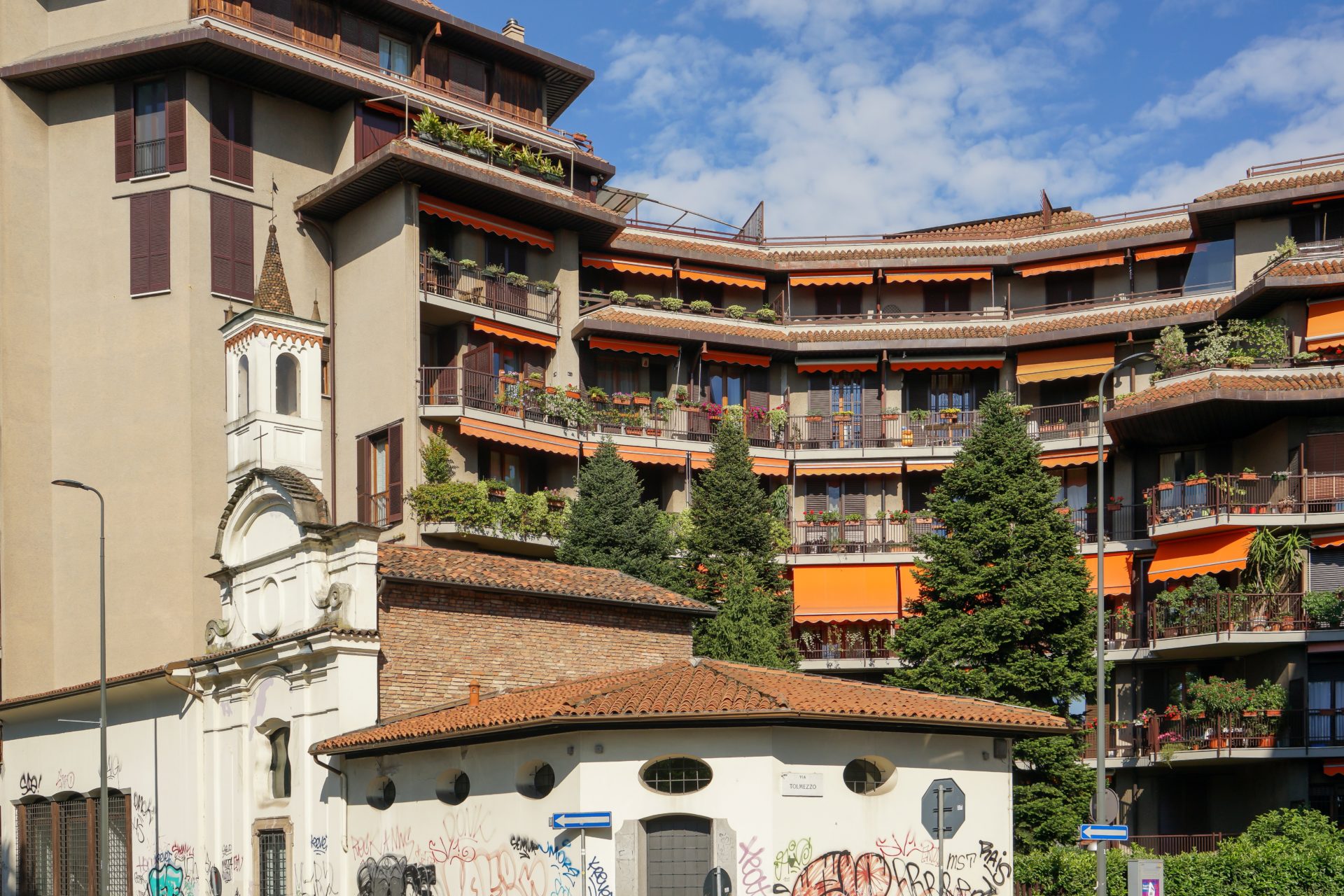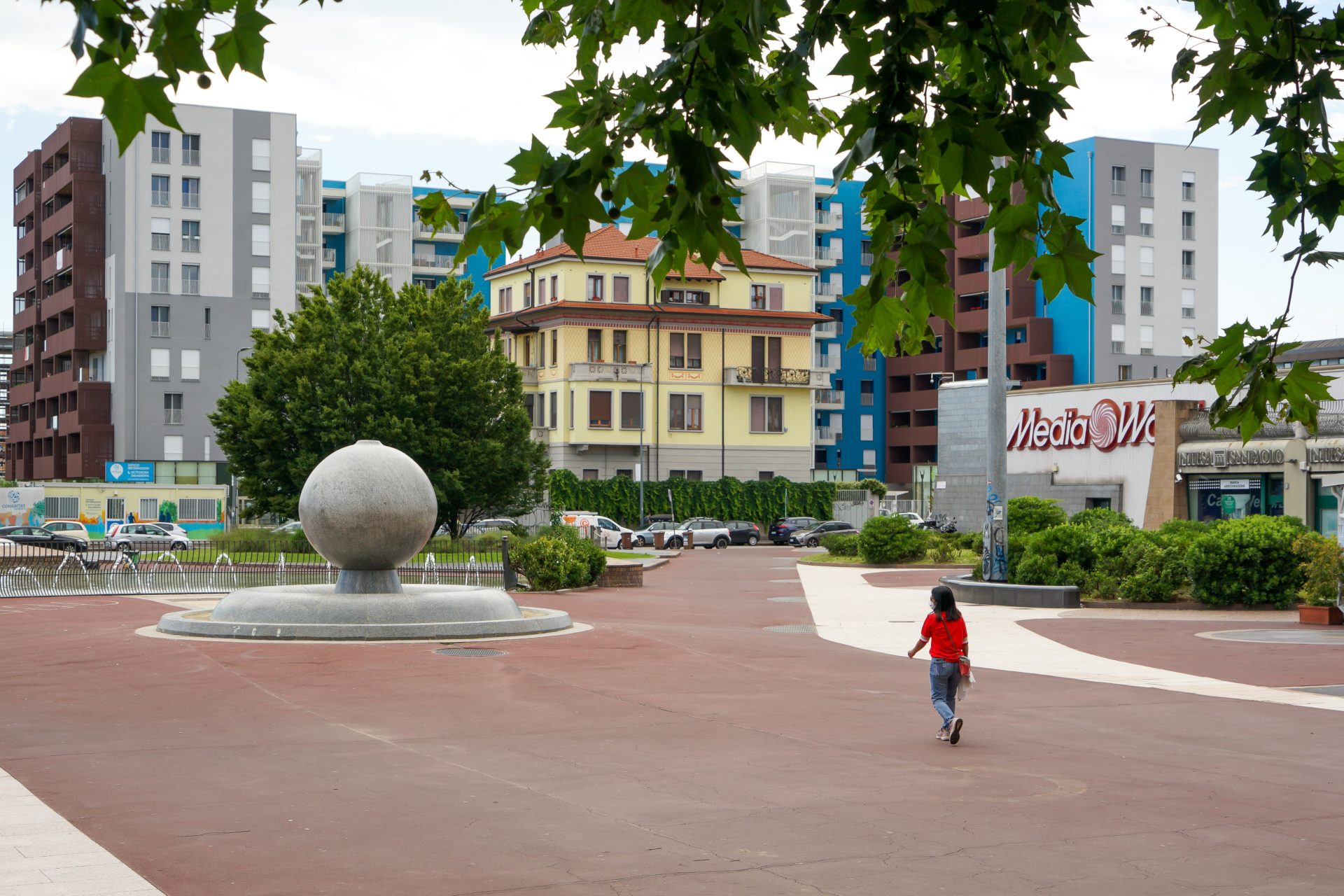 La Madonna di Parco Lambro di Lucio Fontana nella Cittadella Cristiana di Cimiano, con la Chiesa di San Gerolamo Emiliani e le strutture scolastiche e assistenziali retrostanti